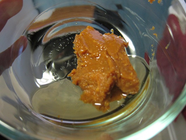 So, put a dollop of miso in a bowl and add about a tablespoon or so of mirin.