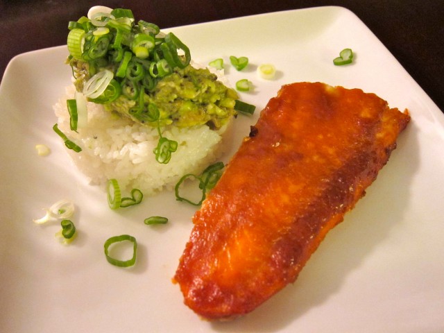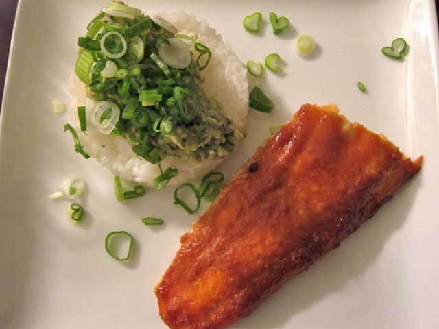 And here it is, alongside the rice topped with mashed avocado and sliced scallions.