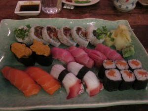 Uni, toro, salmon, octopus, salmon maki, salmon skin roll