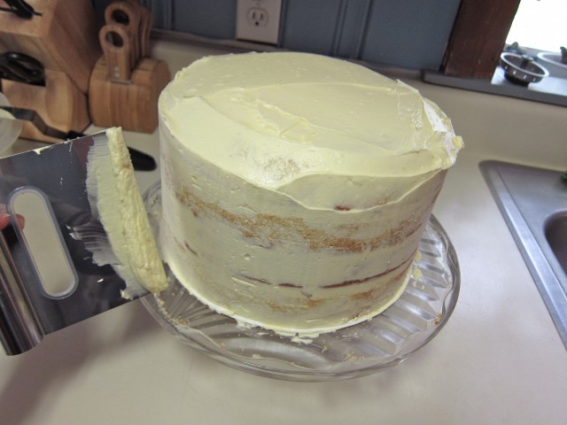 You frost right over the crumbcoat heavily and then use the same tool to scrape it off again, but this time apply less pressure so that you leave more frosting behind. I didn’t get a picture of the finished frosting though, by this point I was getting off schedule for the next step so I wasn’t really thinking about pictures too much.