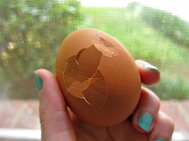 Use the back of a spoon to break the egg all over, making a fine meshwork of cracks. There is a membrane just under the shell that will hold all the pieces in place so don’t worry about breaking it apart, just don’t hit it so hard that you jam shell pieces down into the egg!