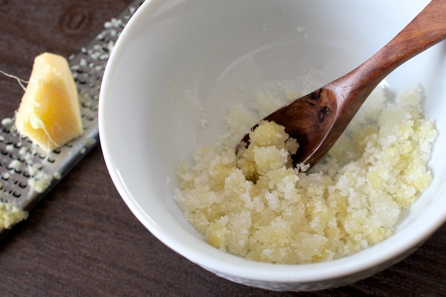 I loved the smell of the ginger sugar as I was making this. The fresh wetness of the grated ginger soaked right into the sugar, lightly dissolving it into the texture of wet sand. It makes a grainy slushing sound as it mixes together, like the sound of walking through melting snow.