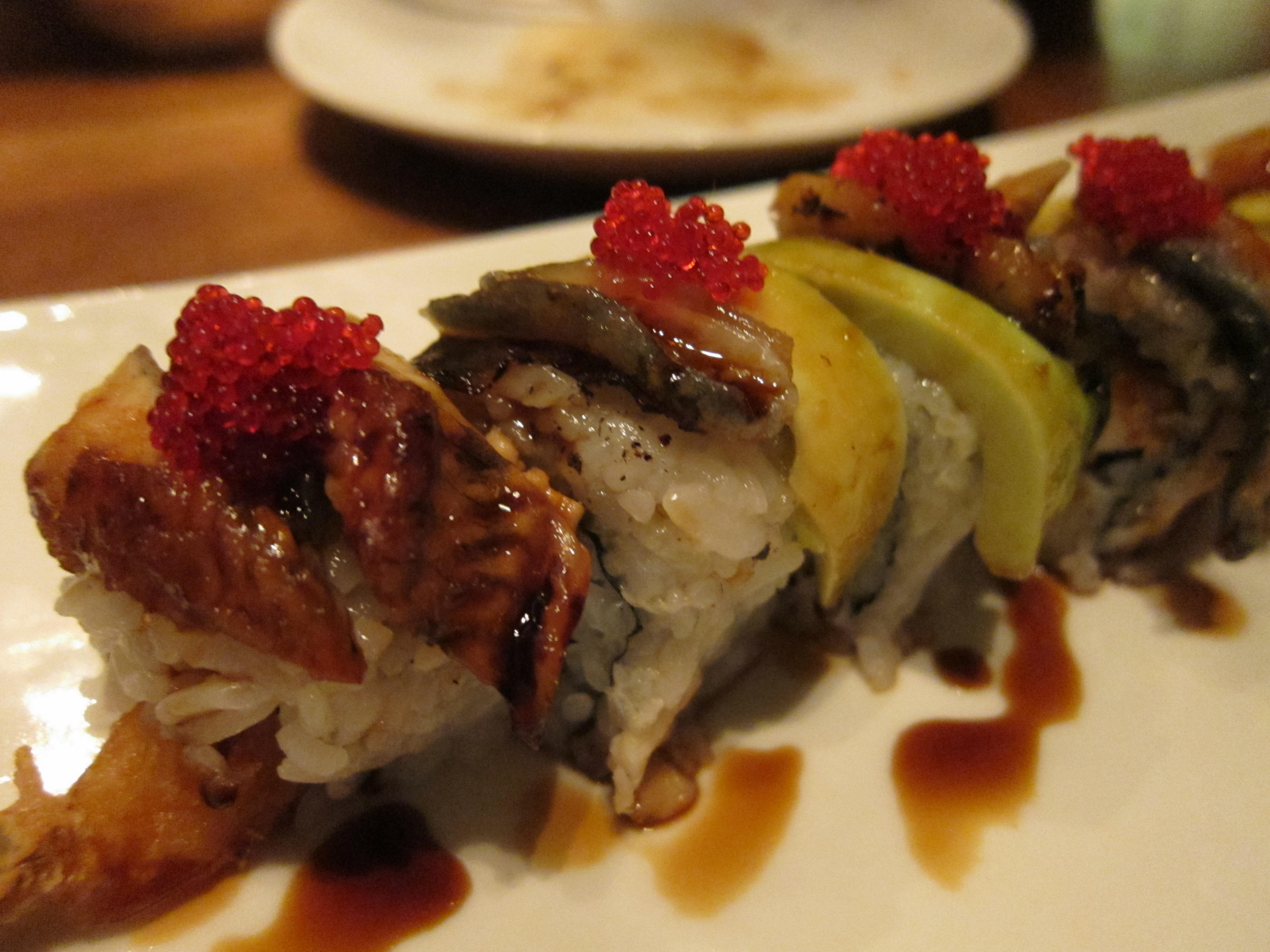 Lastly, we ordered a dragon roll. It had tempura shrimp and cucumber inside and was topped with avocado, flying fish roe, and grilled eel.